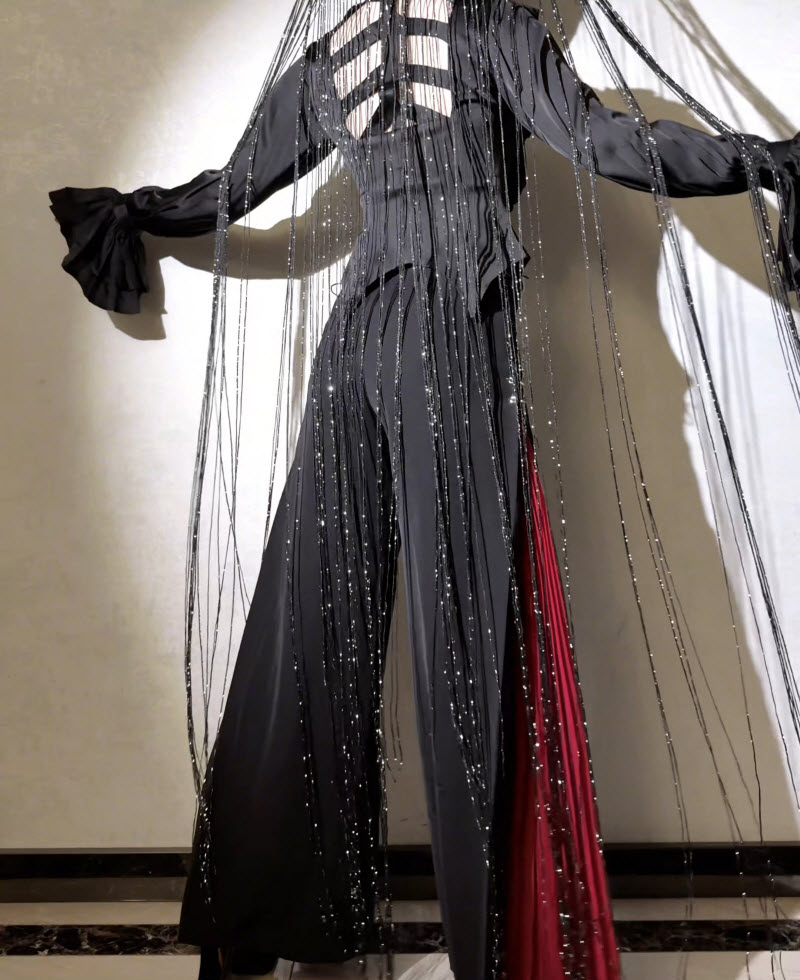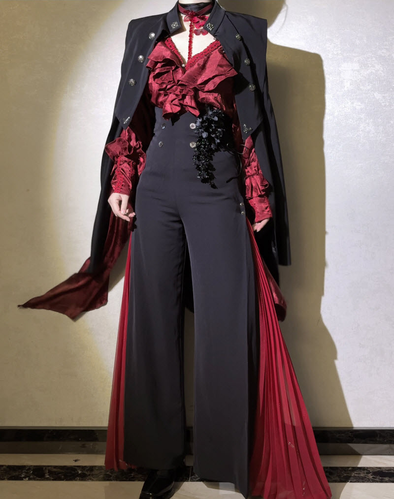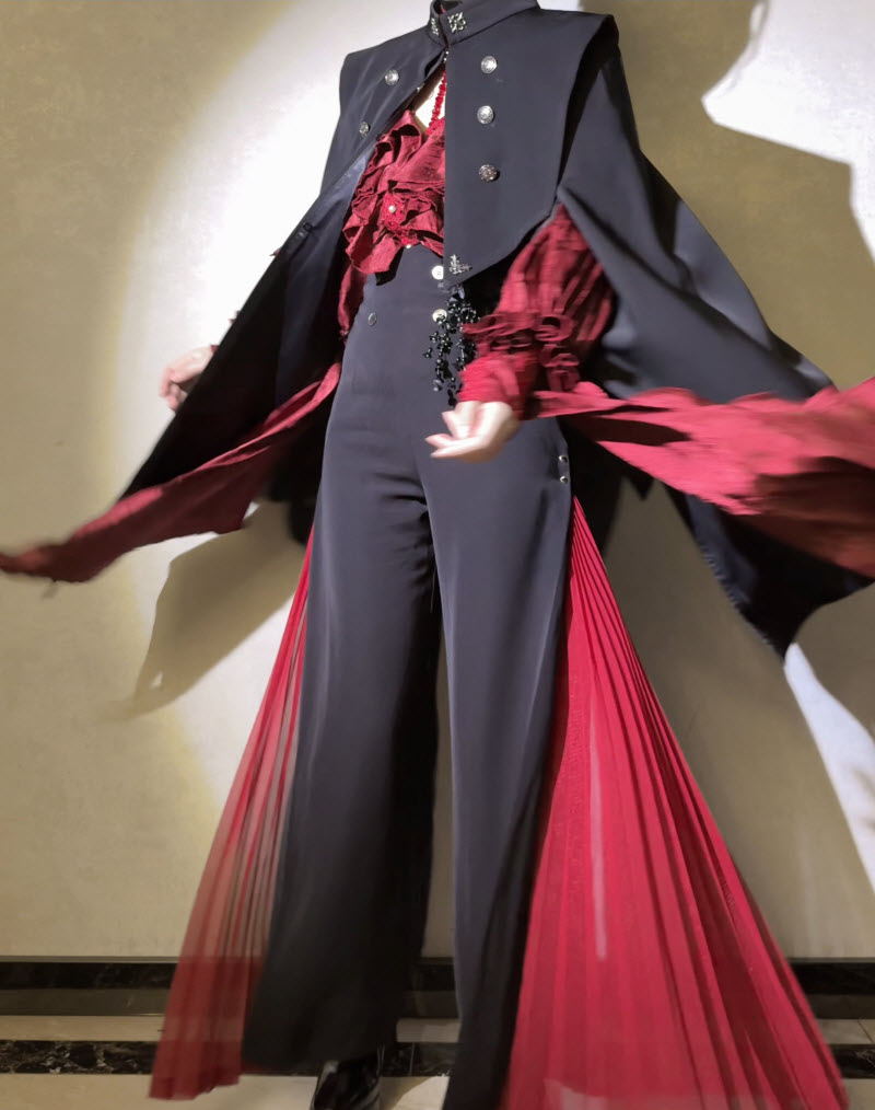 ---> Materials of the Pants: Suit fabric (80T20R) + Pleated chiffon (polyester); Polyester-mixed cotton inner lining (83% polyester + 17% cotton).