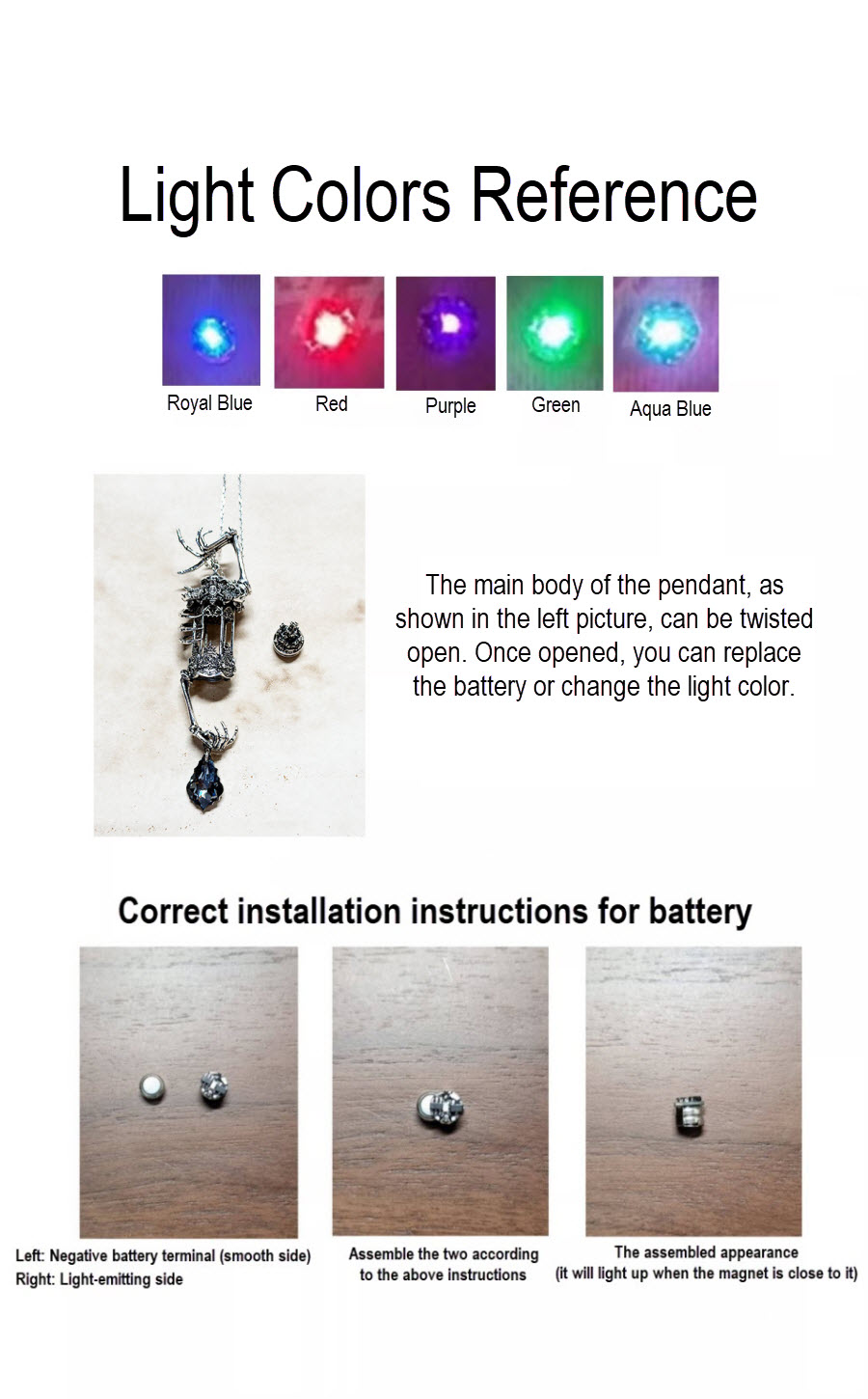 ◆ The necklace itself is antique silver in color. The different color options are determined by the color of the electromagnetic lights inside the necklace. The electromagnetic lights are available in red, royal blue, aqua blue, green and purple. If you wish to purchase addtional electromagnetic lights in different colors, each one is available for just 0.99USD.